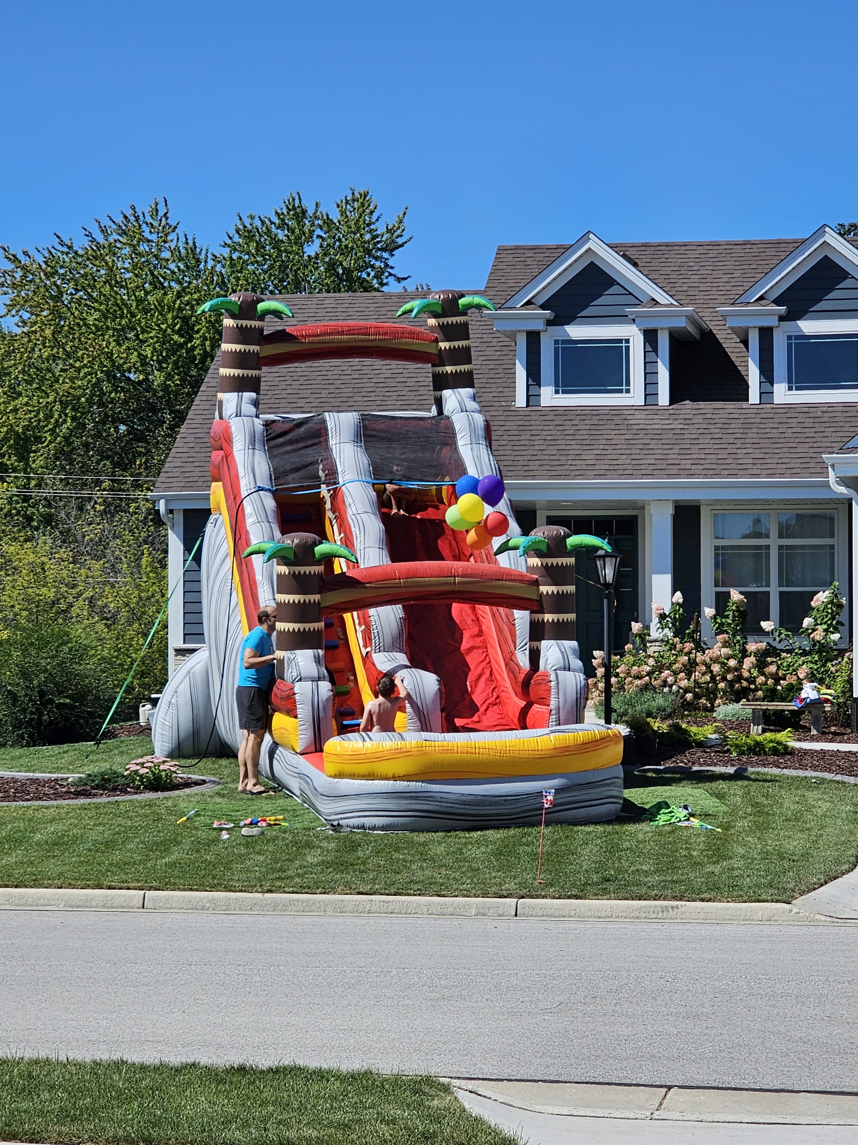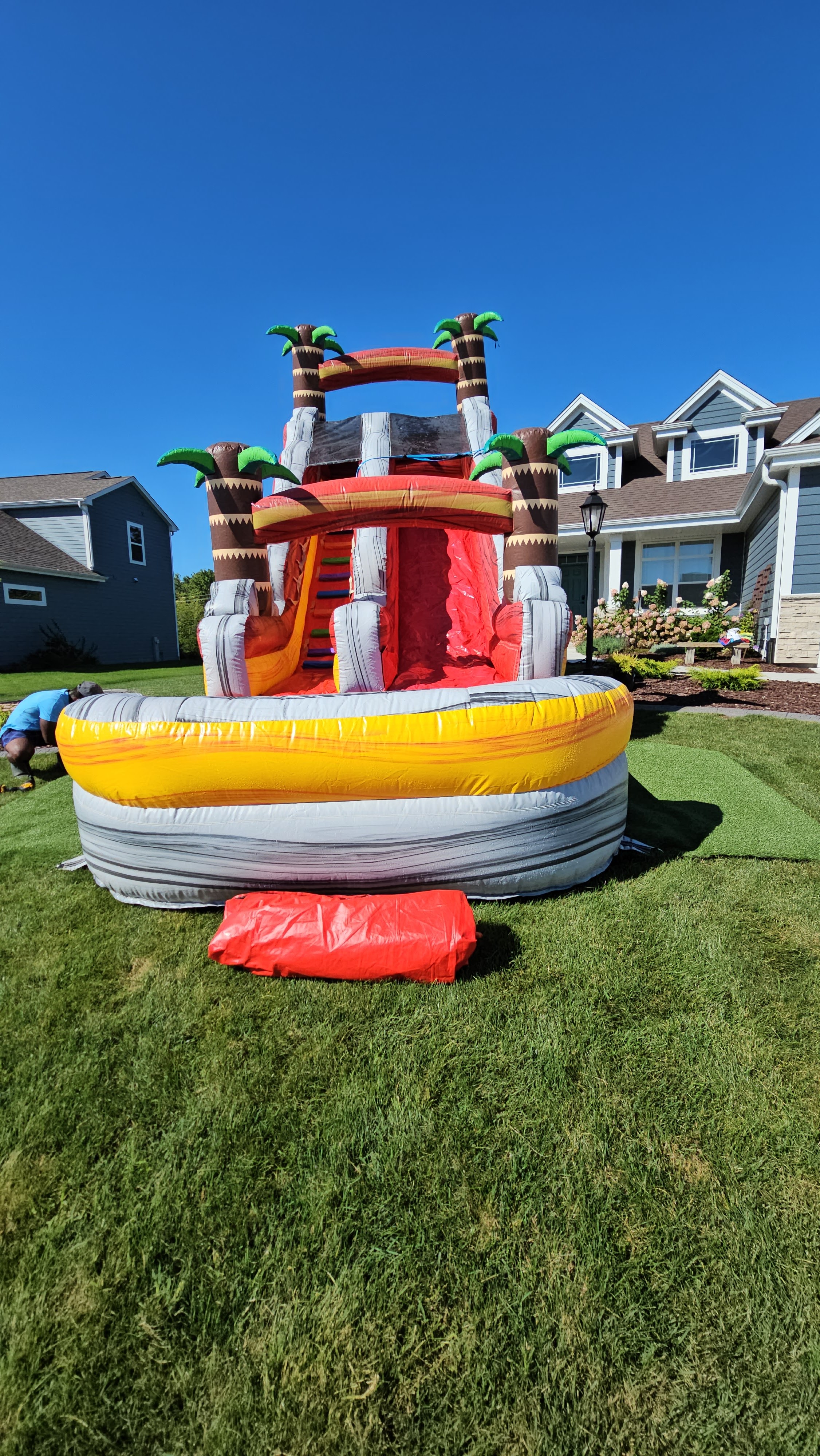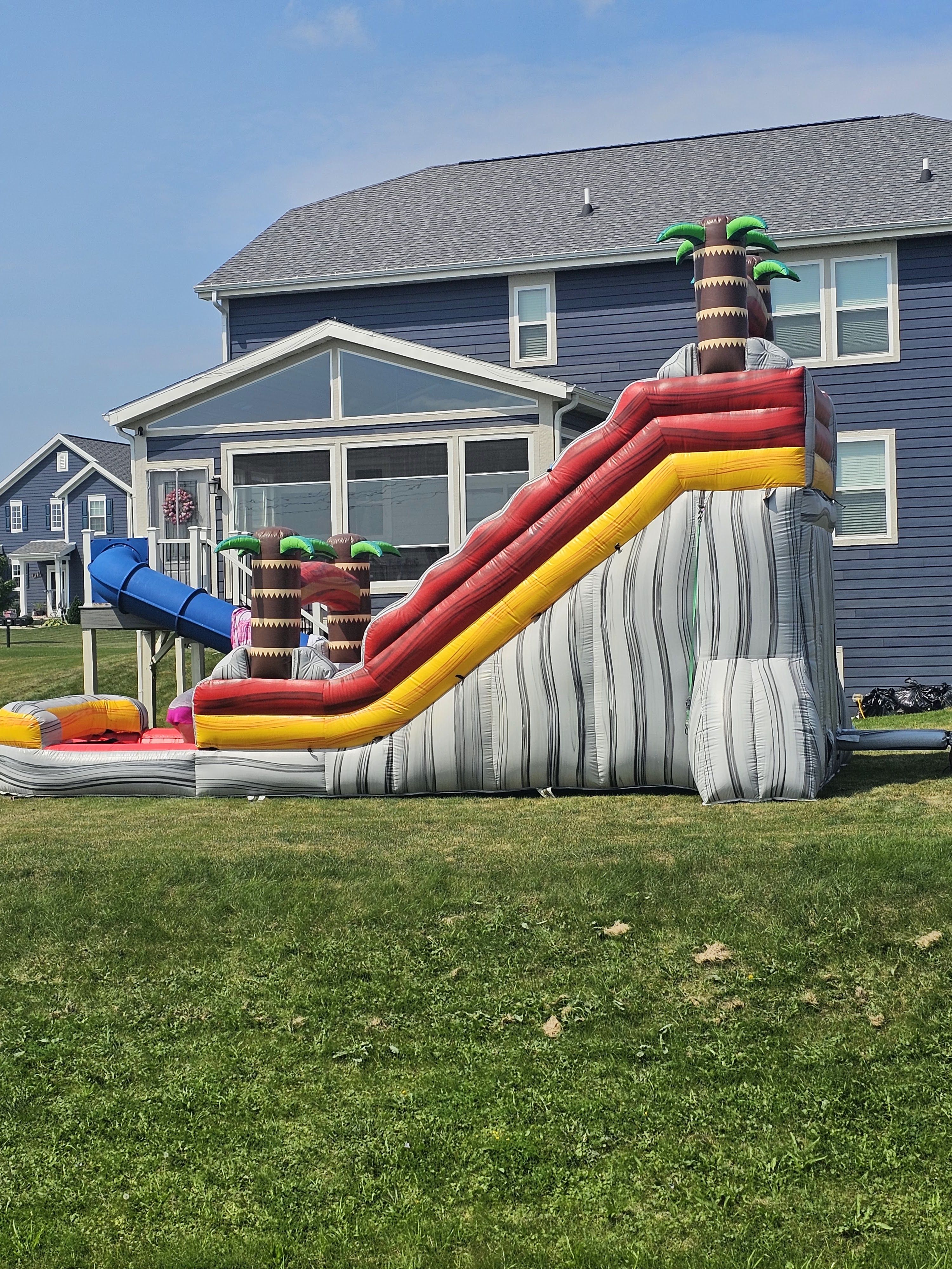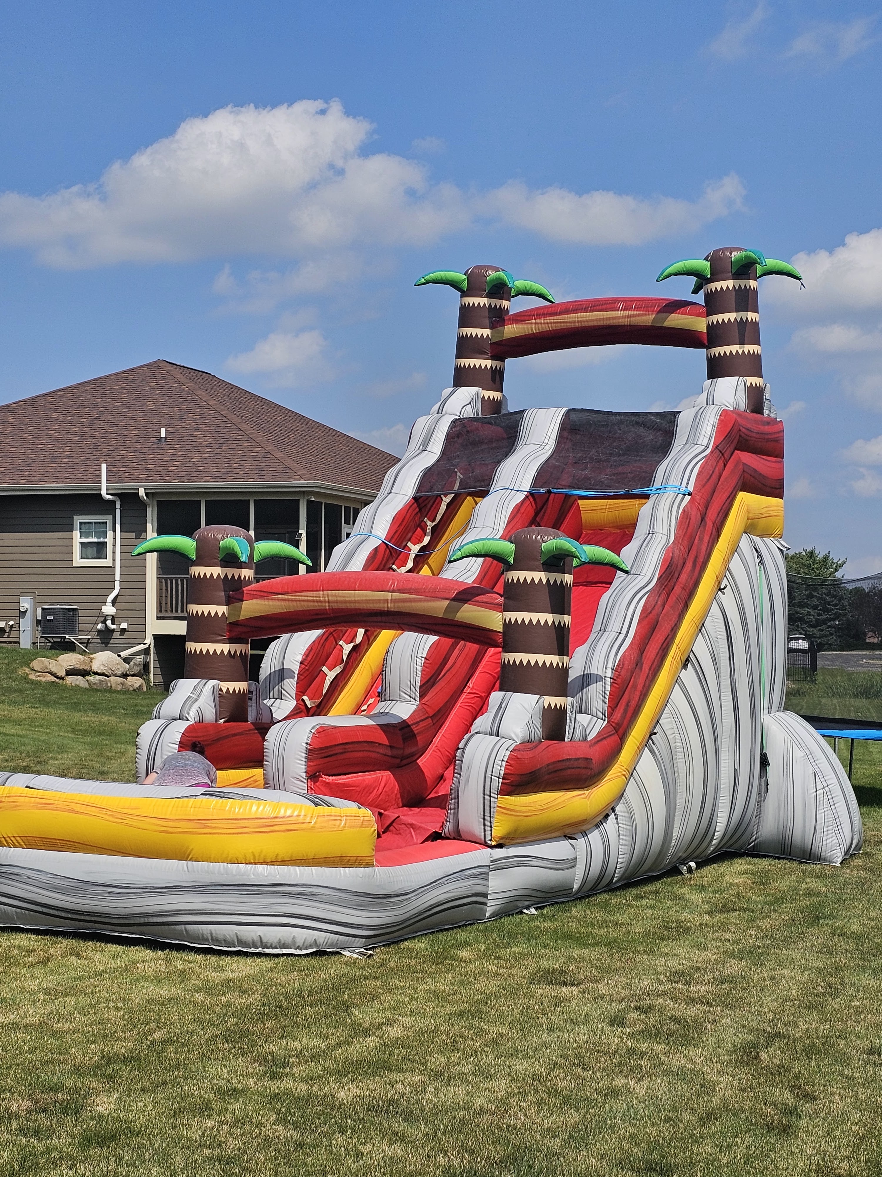 An 18′ high slide. This slide can be rented dry or as a water slide!